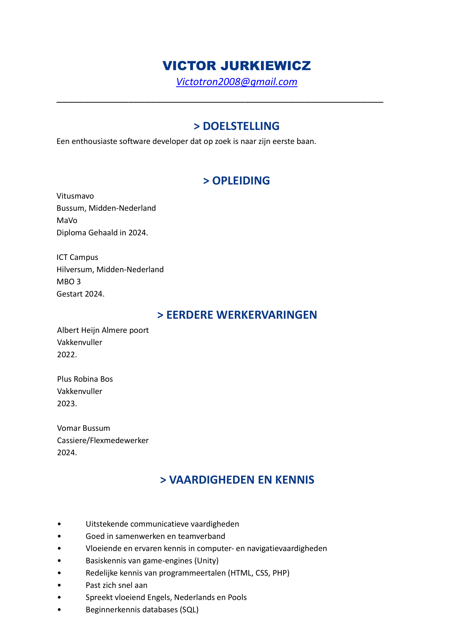 Ik ben opgegroeid in Polen voor de eerste paar jaar van mijn leven, daarna is mijn familie verhuist naar Nederland. ik heb altijd passie gehad aan het ICT maar omdat mijn ouders mij er niets aan lieten doen had ik dat eerder niet kunnen doen. Ik ben later op de ICT Campus in Bussum begonnen met mijn MBO opleiding Software Development, ik ben er zeer blij mee dat ik deze opleiding kan attenderen, omdat ik namelijk eindelijk iets meer kan leren.